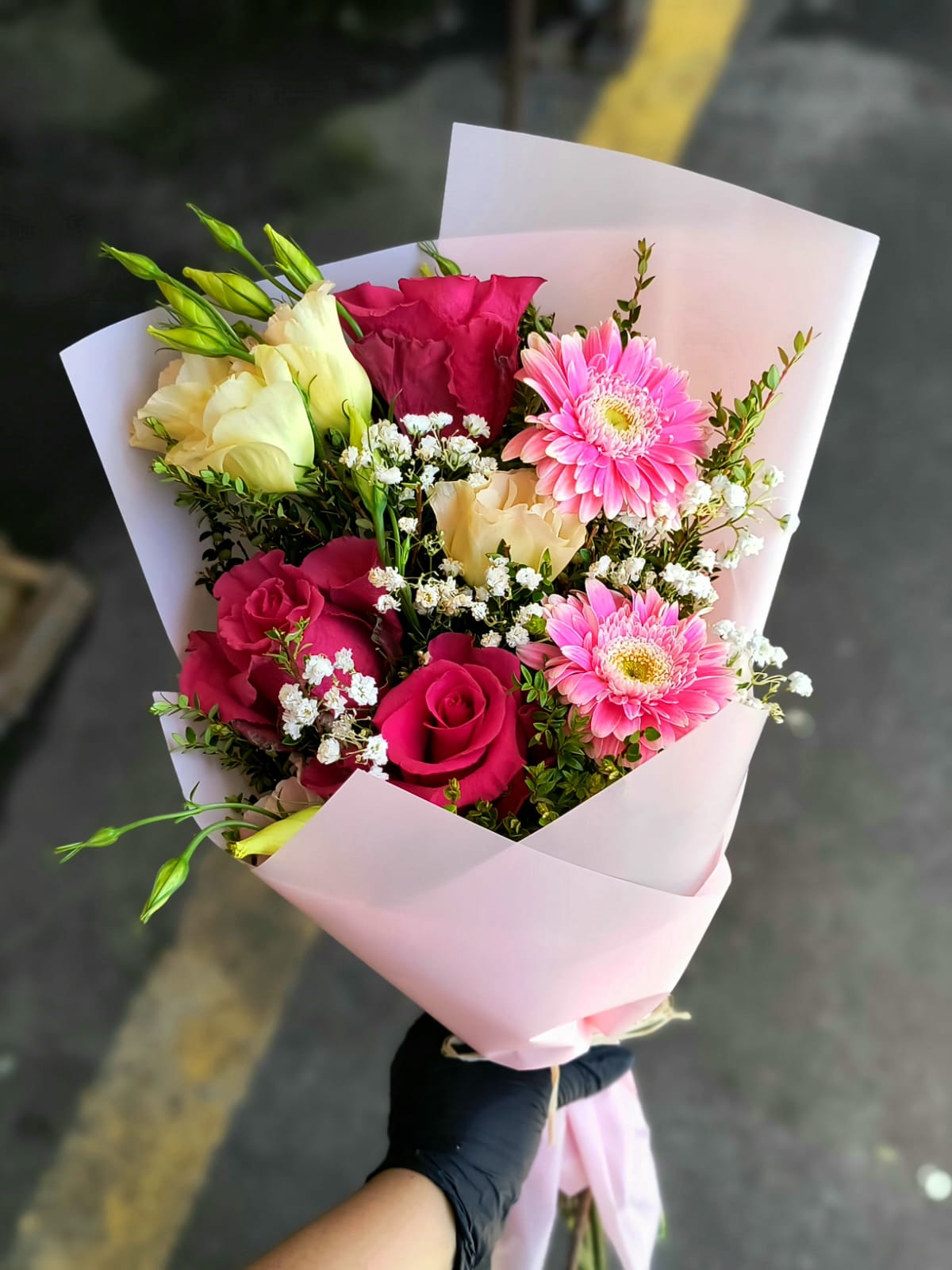 ramo rosado mix de flores rosas y lisianthus