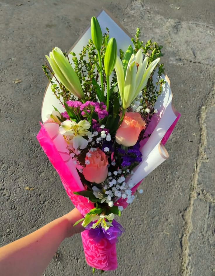 Ramo redondo con un mix de flores de estación incluye tulipanes rosas y girasol