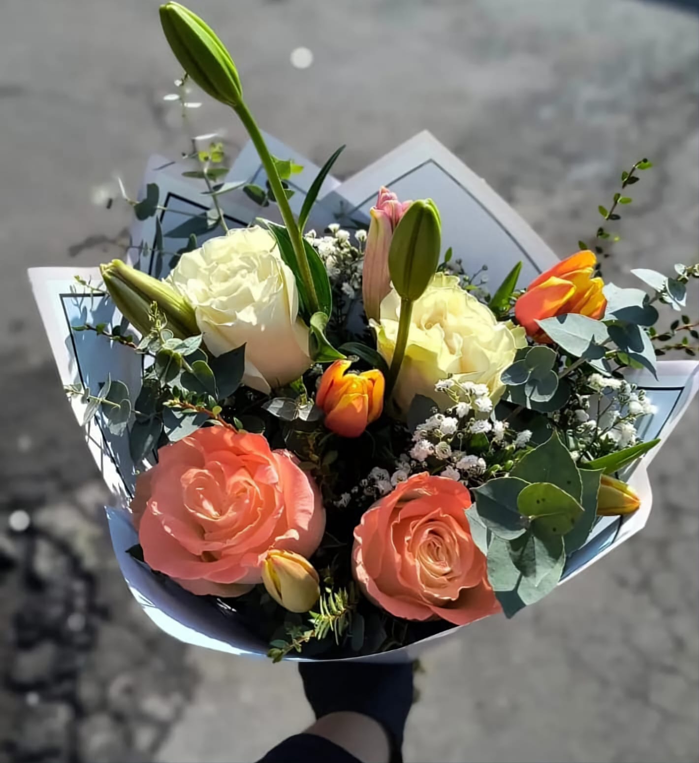 Ramo redondo con mix de flores de estación incluye tulipanes rosas y lilium cantidad